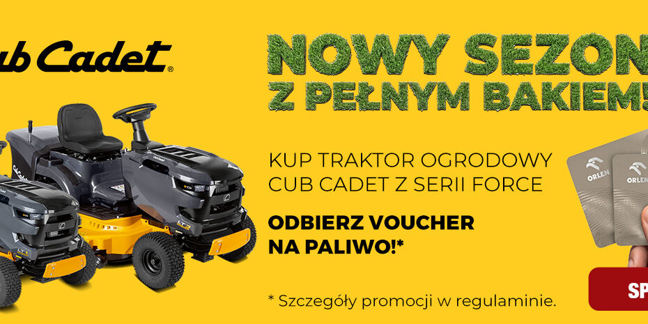 Marka Cub Cadet przygotowała wyjątkową promocję dla osób planujących zakup traktora ogrodowego. Przy zakupie wybranego traktora z serii LT i jego zarejestrowaniu, klient może otrzymać kartę paliwową Orlen. Promocja obowiązuje w terminie: Aby skorzystać z… Dowiedz się więcej »Nowy sezon z pełnym bakiem – promocja Cub Cadet